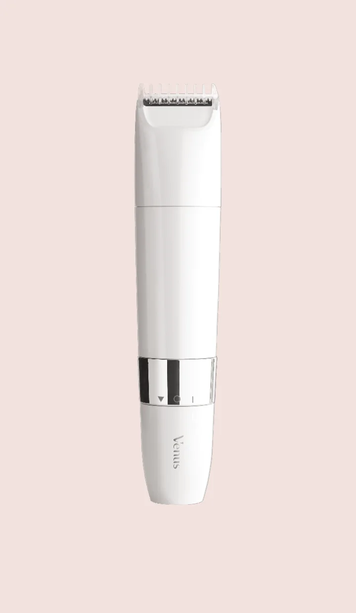 La recortadora Venus para el vello púbico ofrece una herramienta para mujeres que prefieren recortar y dar forma al vello púbico, completando la lista de todos los métodos clave para cuidar el vello y la piel púbicos. La recortadora también está diseñado para ayudar a proteger la piel púbica de los tirones del vello y proporciona una eliminación suave del vello con aletas protectoras de la piel. Esta recortadora suave es impermeable y puede usarse tanto dentro como fuera de la ducha.